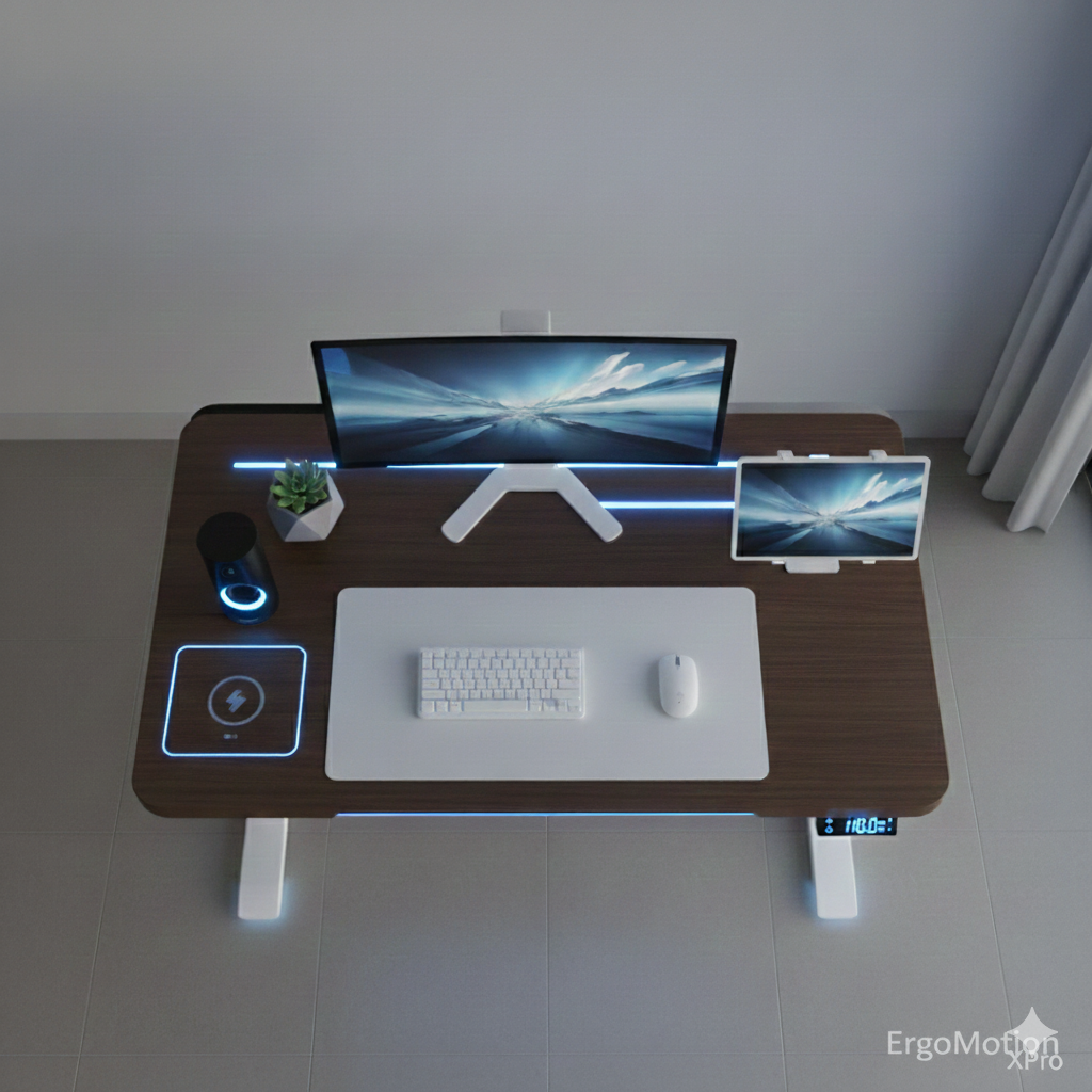 Mit seiner eleganten Holzplatte, dem stabilen Metallgestell und der stylischen LED-Lichtleiste setzt der ErgoMotion XPro ein klares Statement.