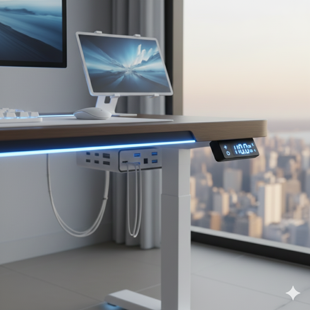 Der Tisch wirkt modern, aufgeräumt und futuristisch – ideal für Technikliebhaber, Designer und alle, die Wert auf ein optisches Highlight legen.